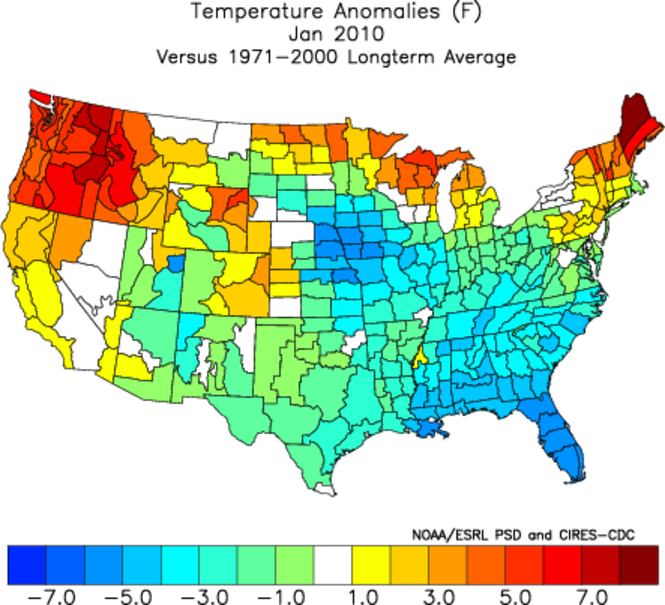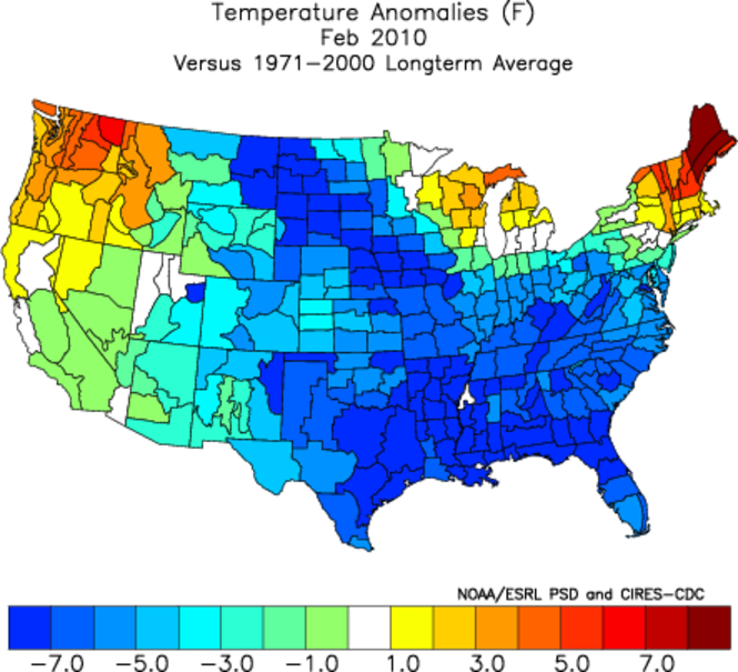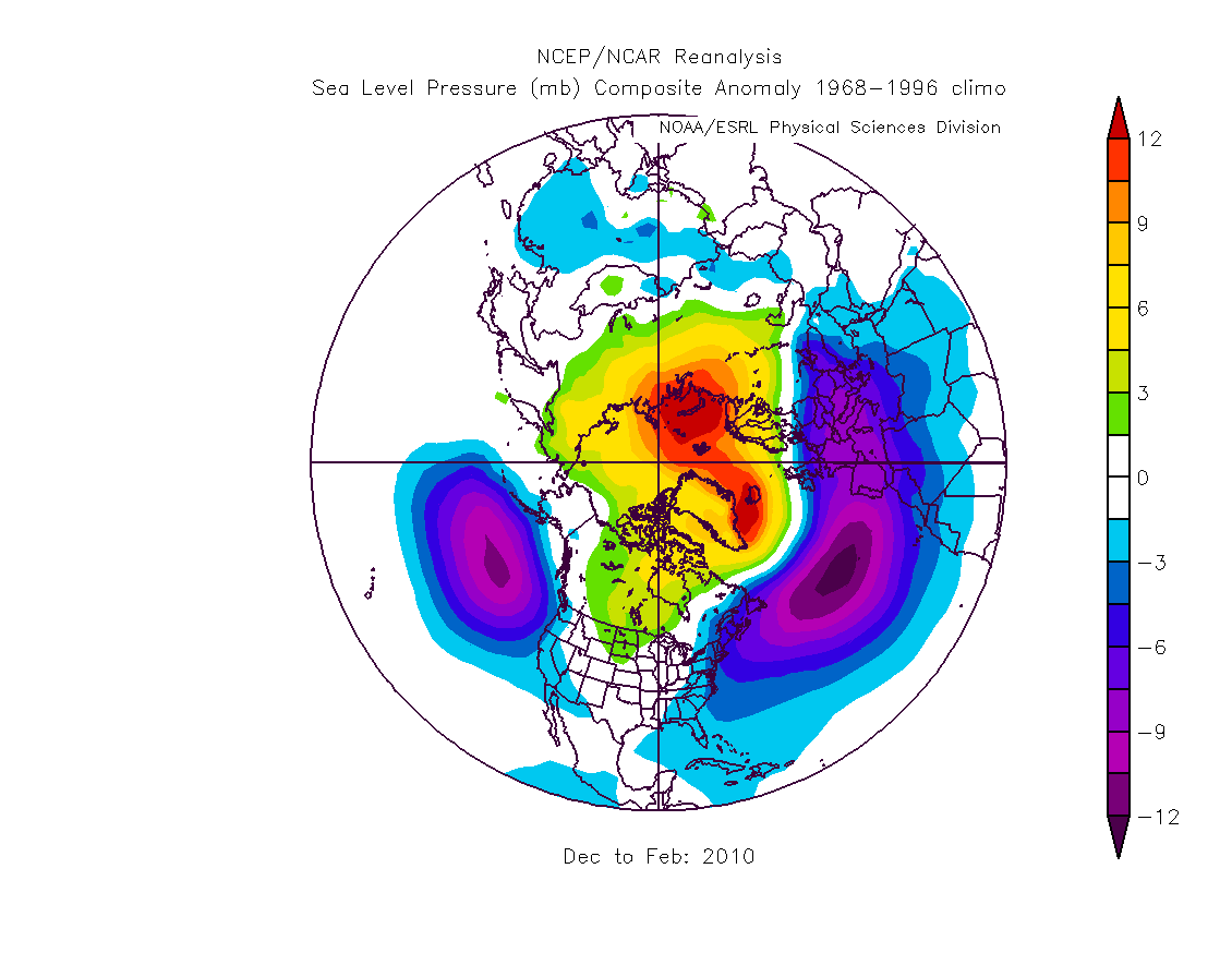 Here is an image of the December to February Sea-Level Pressure anomalies accross the Northern Hemisphere. There are some features that clearly stand out in this graphic. The large area of negative anomalies in the North Pacific show the southward displacement of the Aleutin Low. The location is also a feature seen for a neutral to positive PDO pattern. There was also a large area of negative anomalies in the North Ceneral Atlantic Ocean showing the southward displacement of the Icelandic Low(highly negative NAO pattern). Lastly, there was the large area of well above normal anomalies across the Artic Ocean and Greenland.(highly negative AO pattern)