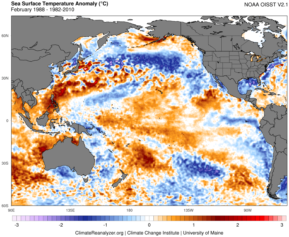 | **Anomalies calculated using 30-year climatological values, updated every five years. The updating of base periods removes observed warming trend in Nino 3.4 region. Anomalies generated from CPC** | |||