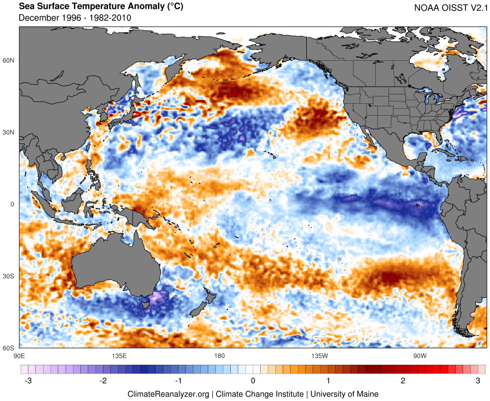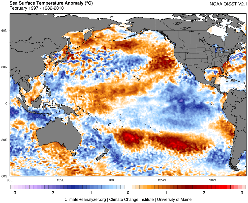 | **Anomalies calculated using 30-year climatological values, updated every five years. The updating of base periods removes observed warming trend in Nino 3.4 region. Anomalies generated from CPC** | |||