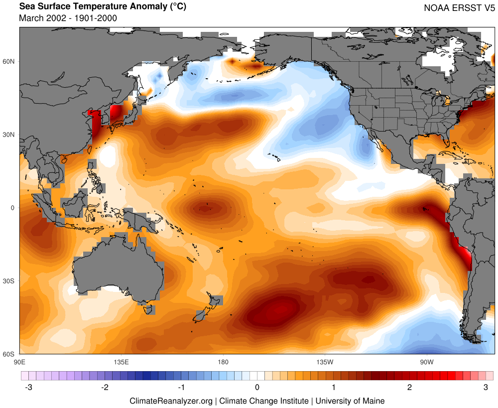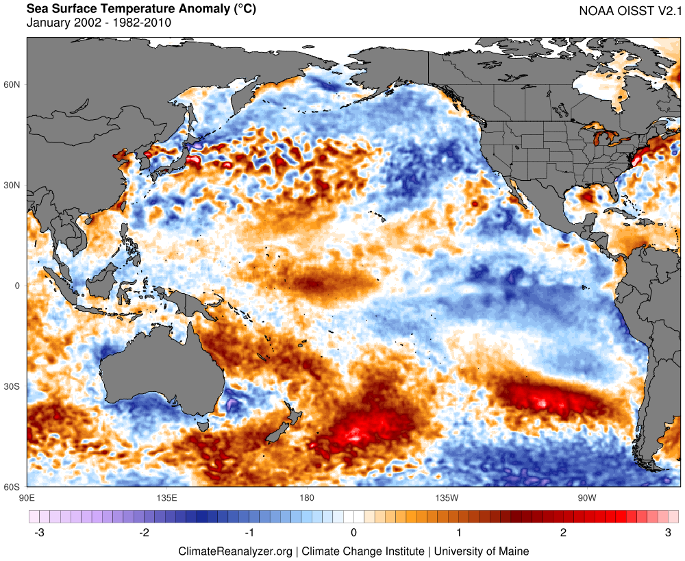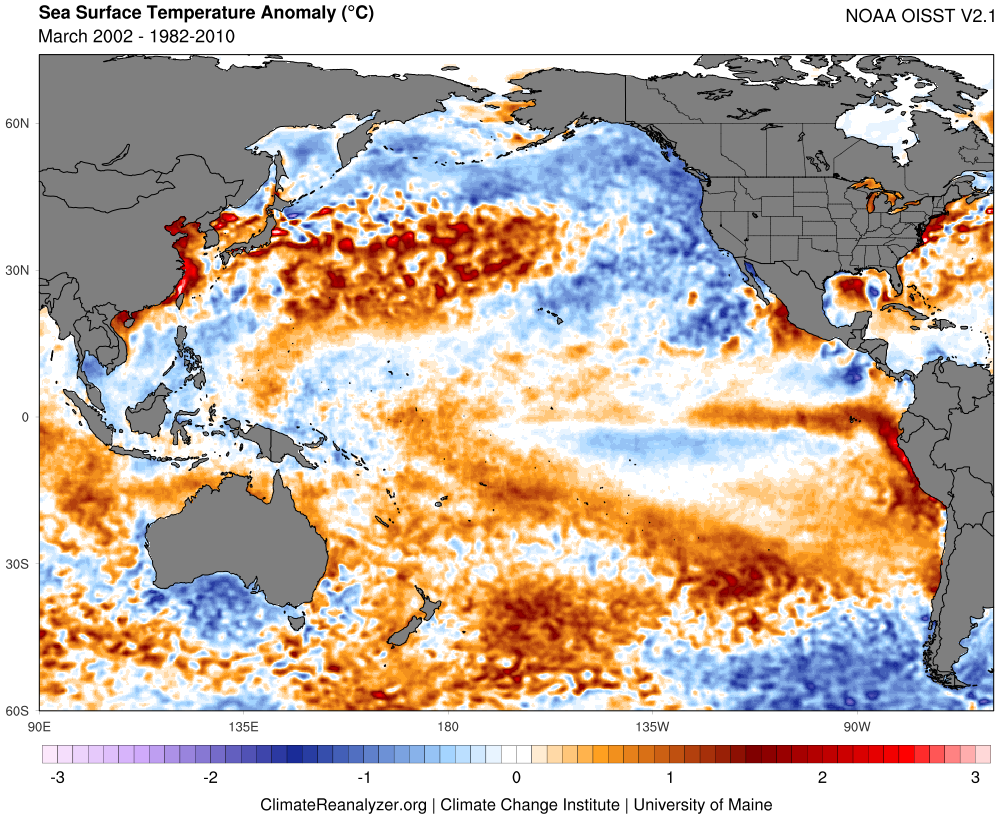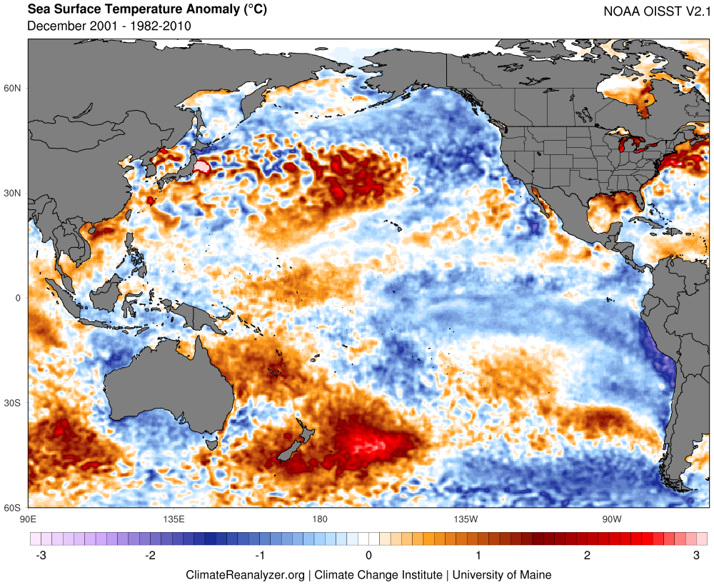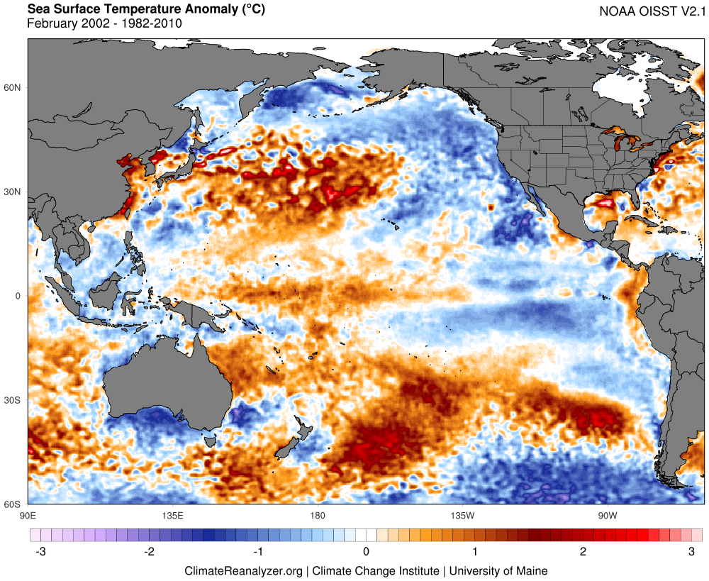 | **Anomalies calculated using 30-year climatological values, updated every five years. The updating of base periods removes observed warming trend in Nino 3.4 region. Anomalies generated from CPC** | |||