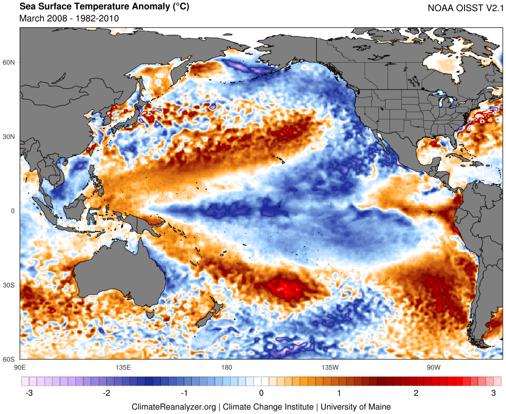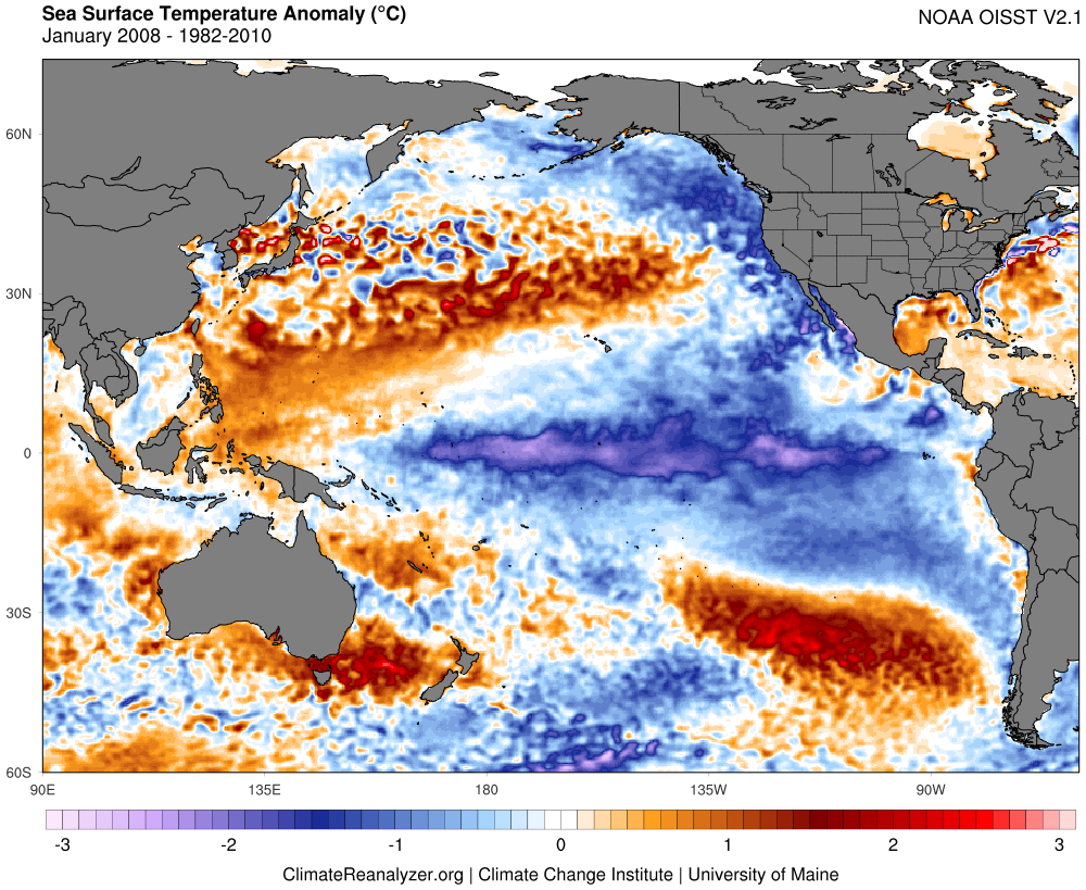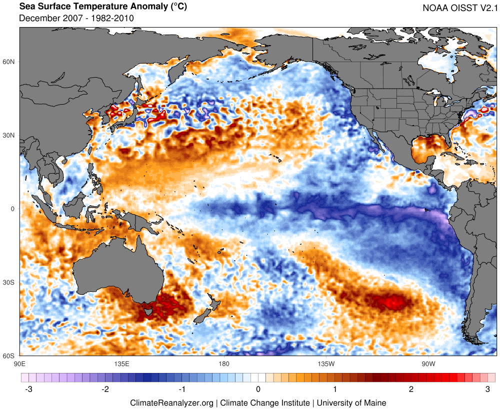 | **Anomalies calculated using 30-year climatological values, updated every five years. The updating of base periods removes observed warming trend in Nino 3.4 region. Anomalies generated from CPC** | |||